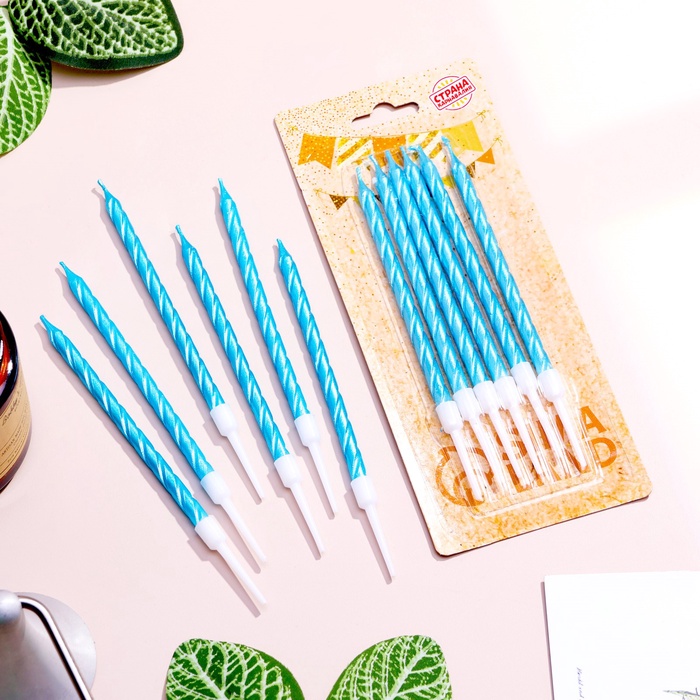 Свечи в торт витые с подставкой, 6 шт., 11 см, небесно-голубой