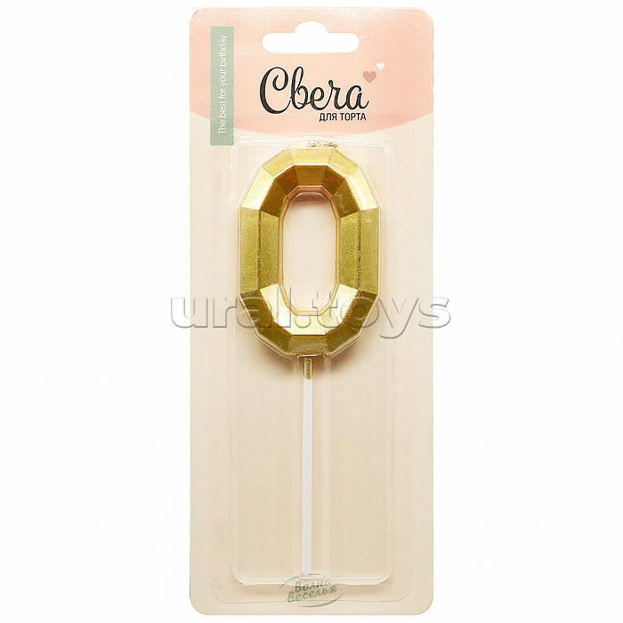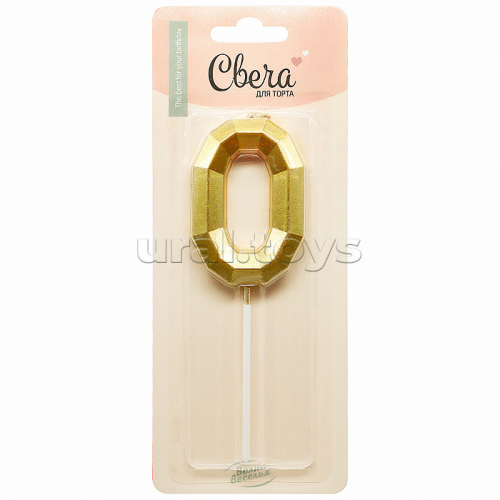 Свеча Цифра, 0 Объемные грани, на шпажке, Золото, Металлик, 4,5*7 + 7 см, 1 шт. с держателем