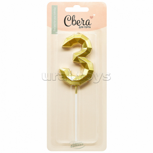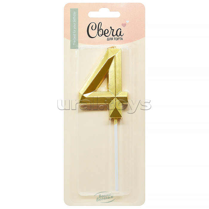 Свеча Цифра, 4 Объемные грани, на шпажке, Золото, Металлик, 4,5*7 + 7 см, 1 шт. с держателем