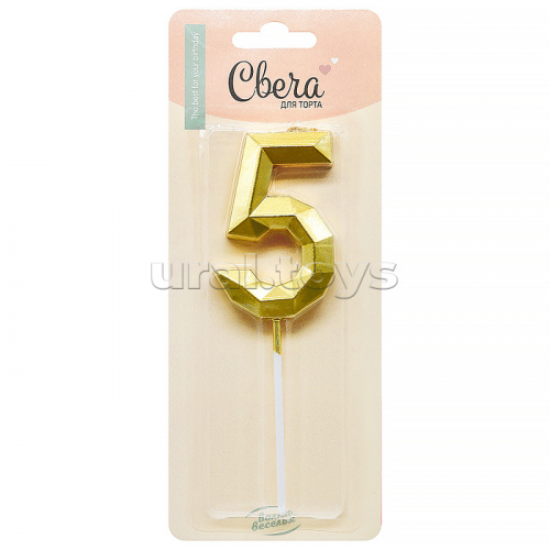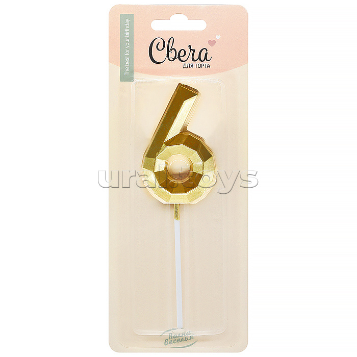 Свеча Цифра, 6 Объемные грани, на шпажке, Золото, Металлик, 4,5*7 + 7 см, 1 шт. с держателем