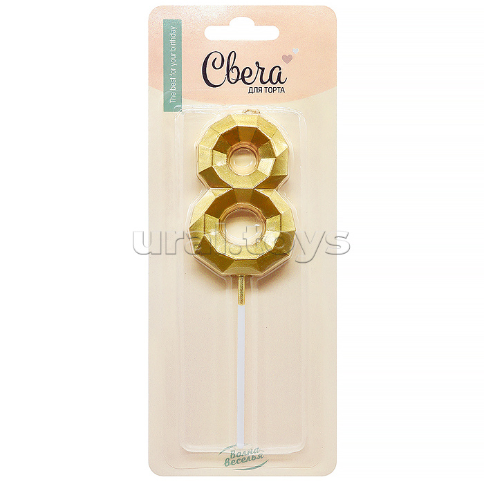 Свеча Цифра, 8 Объемные грани, на шпажке, Золото, Металлик, 4,5*7 + 7 см, 1 шт. с держателем