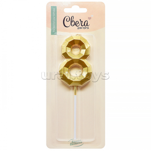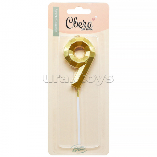 Свеча Цифра, 9 Объемные грани, на шпажке, Золото, Металлик, 4,5*7 + 7 см, 1 шт. с держателем