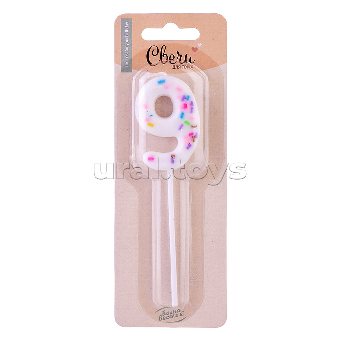 Свеча Цифра, 9 Сладкое конфетти, Белый, 5 + 7 см, 1 шт. с держателем