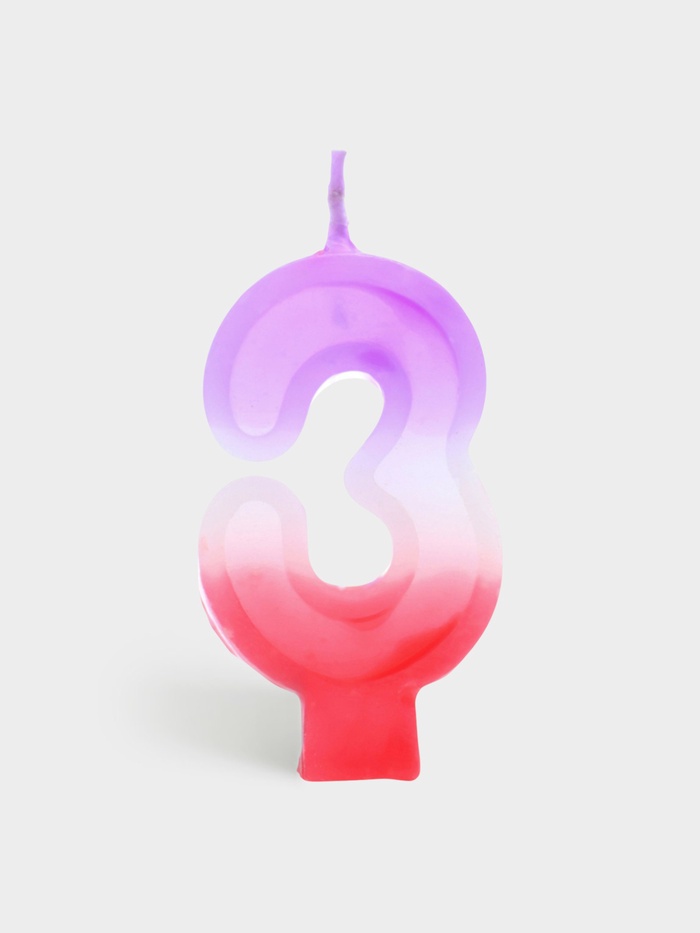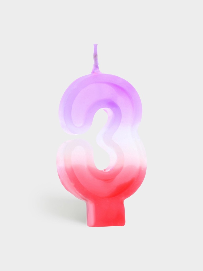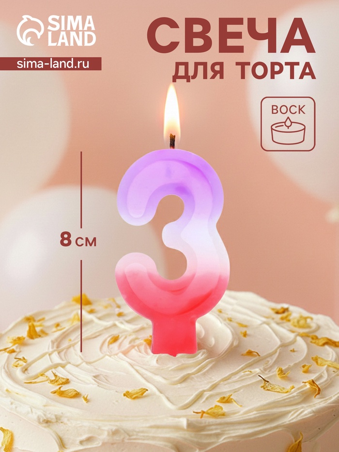 Свеча цифра «3» — яркий акцент для торта в градиенте от нежно-фиолетового к розовому. Высота 8 см делает её заметной даже на большом десерте, а мягкие пастельные тона добавляют празднику утончённости и лёгкости. Без аромата — не перебивает вкус выпечки и подходит для любого возраста.