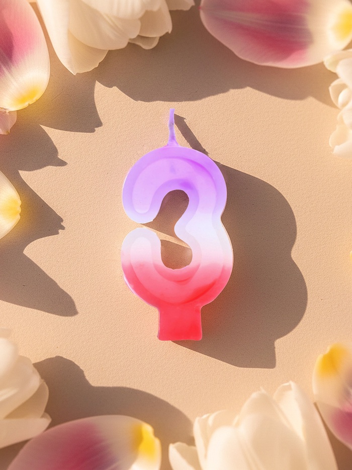 Эта свеча — не просто цифра, а символ завершения первого цикла. Третий день, третья победа, третий торт — всё становится ярче, осознаннее и полнее. Без запаха, без шума — только свет, цвет и момент, который хочется запомнить.