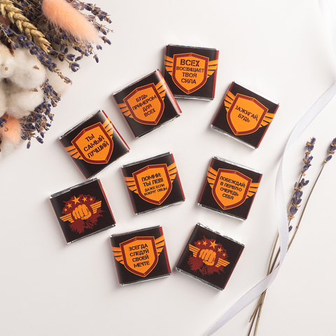 Каждая шоколадка упакована в индивидуальную этикетку с пожеланием.