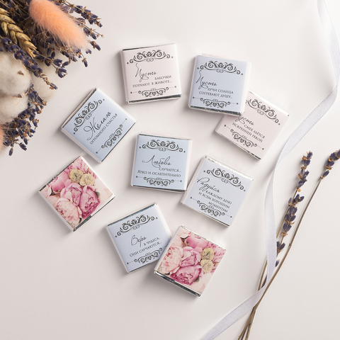 Каждая шоколадка упакована в индивидуальную этикетку с пожеланием.