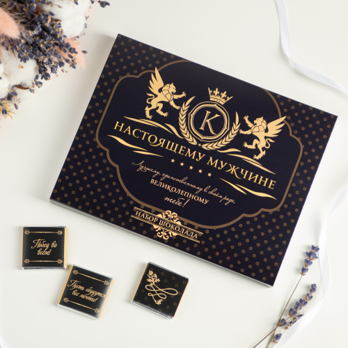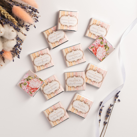 Каждая шоколадка упакована в индивидуальную этикетку с пожеланием.