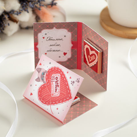 Внутри открытки - 1 шоколадка (вес 5 г., размер: 31 х 31 мм.)