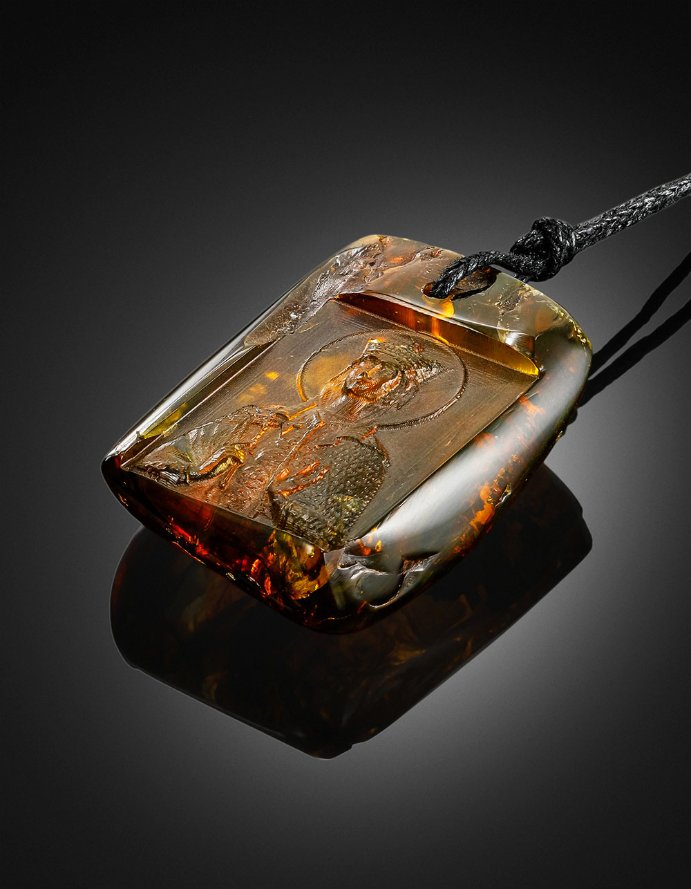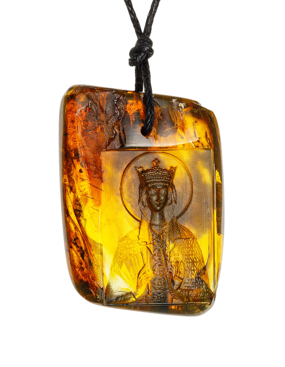 Цельная подвеска из натурального янтаря с резьбой «Святая Людмила»