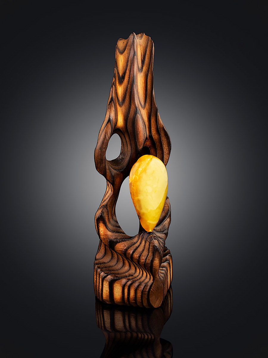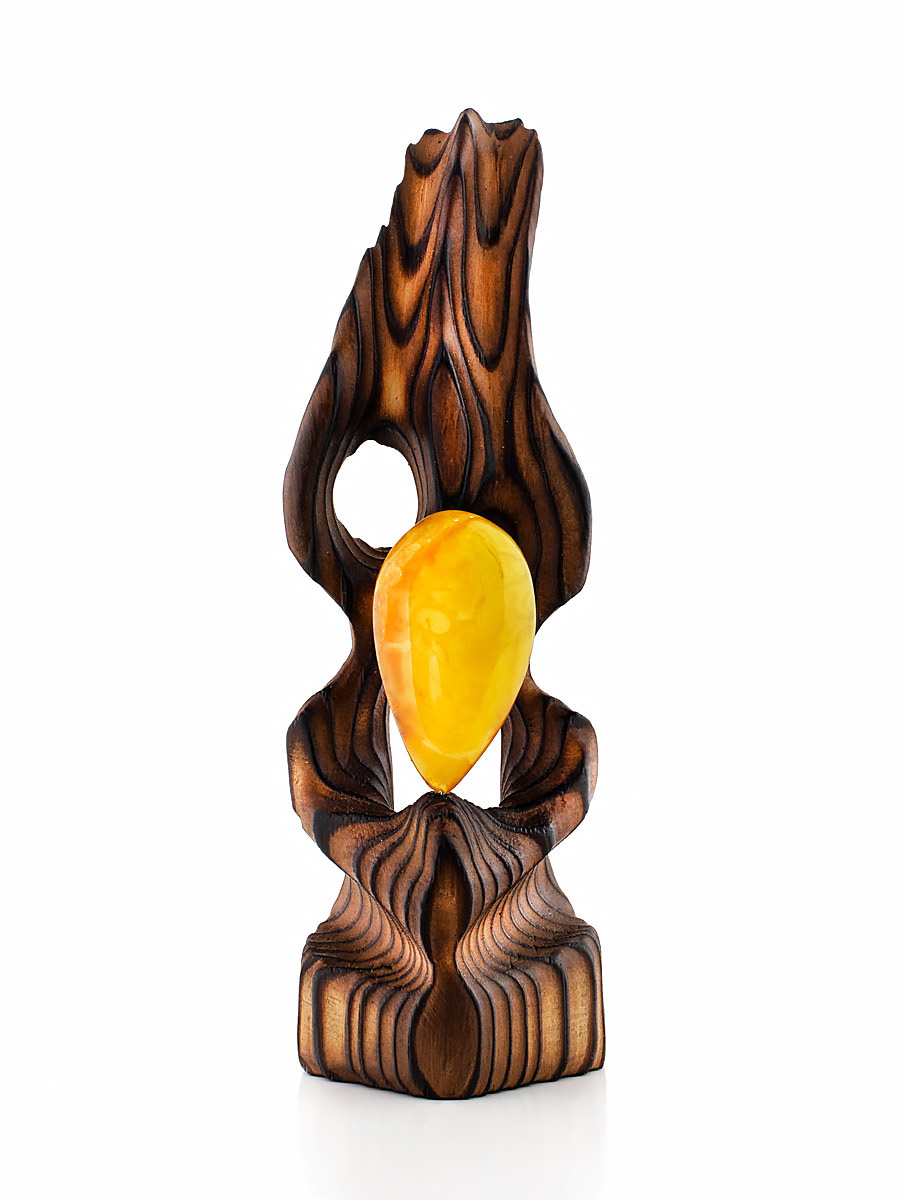 Декоративная статуэтка из дерева, украшенная цельным кусочком натурального янтаря