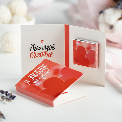 Внутри открытки - 1 шоколадка (вес 5 г., размер: 31 х 31 мм.)