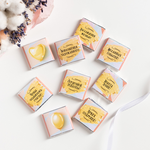 Каждая шоколадка упакована в индивидуальную этикетку с пожеланием.