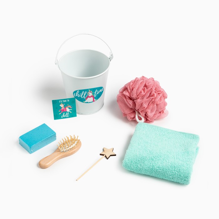 Составляющие набора: Открытка, Полотенце, Мочалка, Ведёрко, Пемза, Расчёска для волос