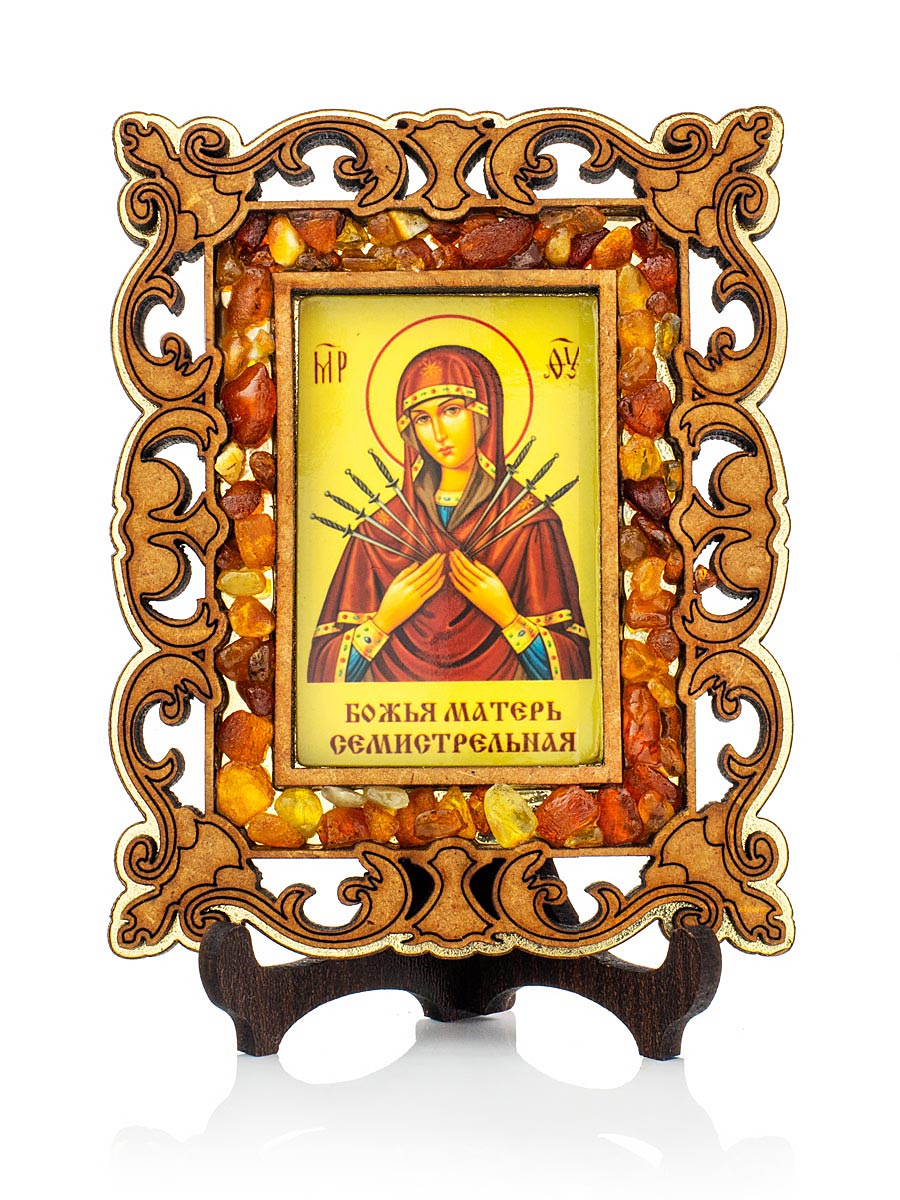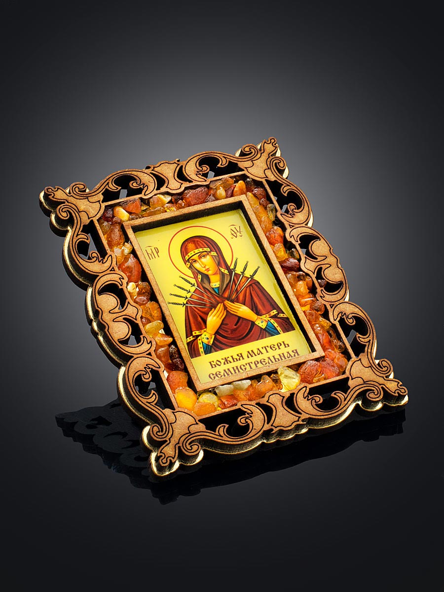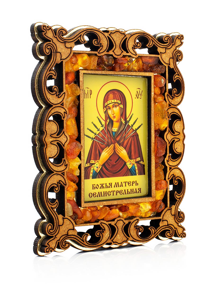 Икона Богоматери «Семистрельная» в резной деревянной оправе с магнитом, украшенная янтарём
