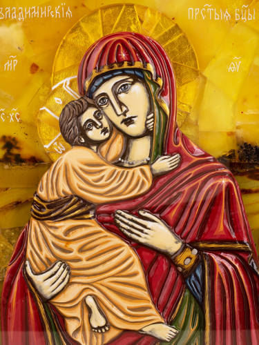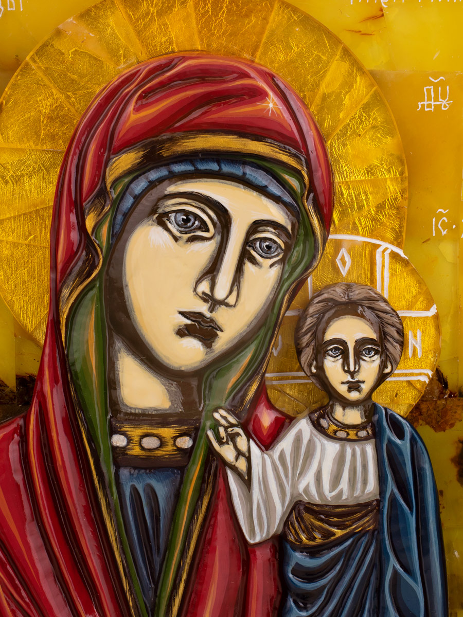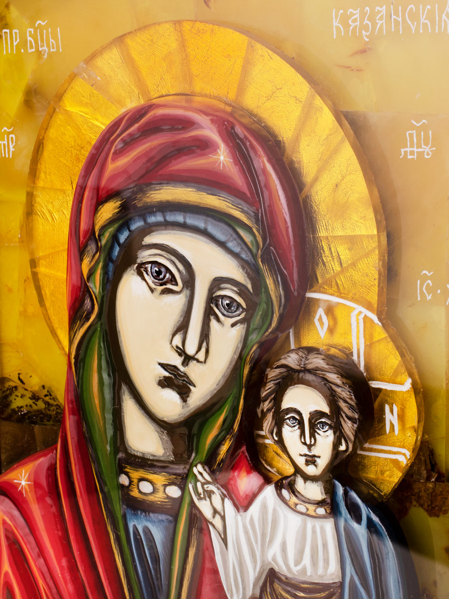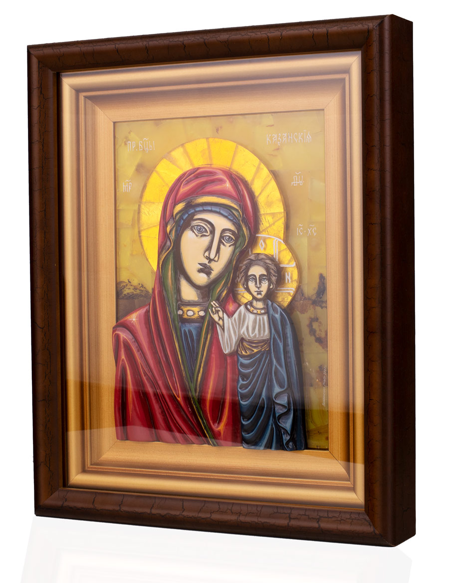 Икона ручной росписи с натуральным балтийским янтарём «Казанская Богоматерь»