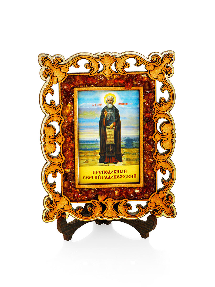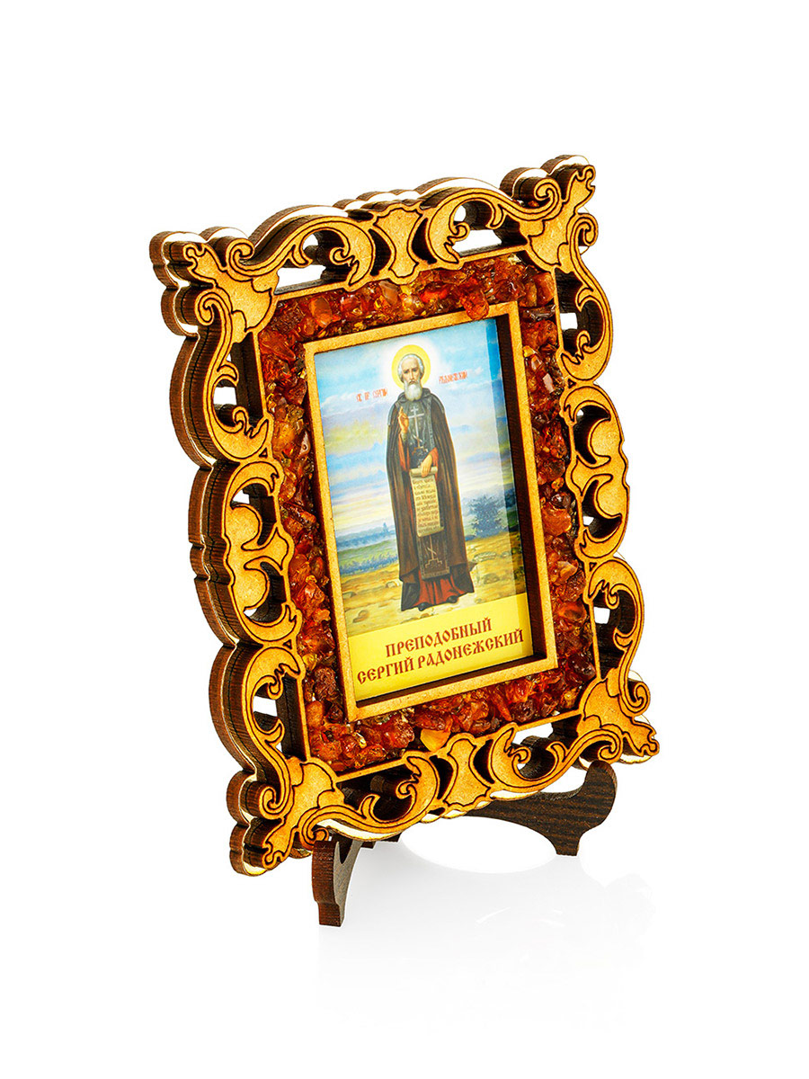 Иконка «Преподобный Сергий Радонежский» в резном обрамлении с янтарём