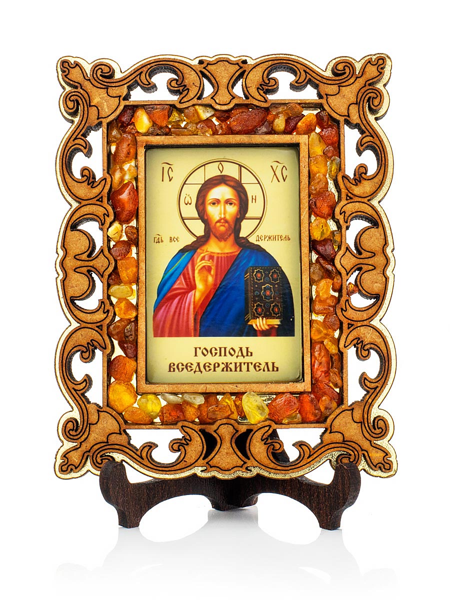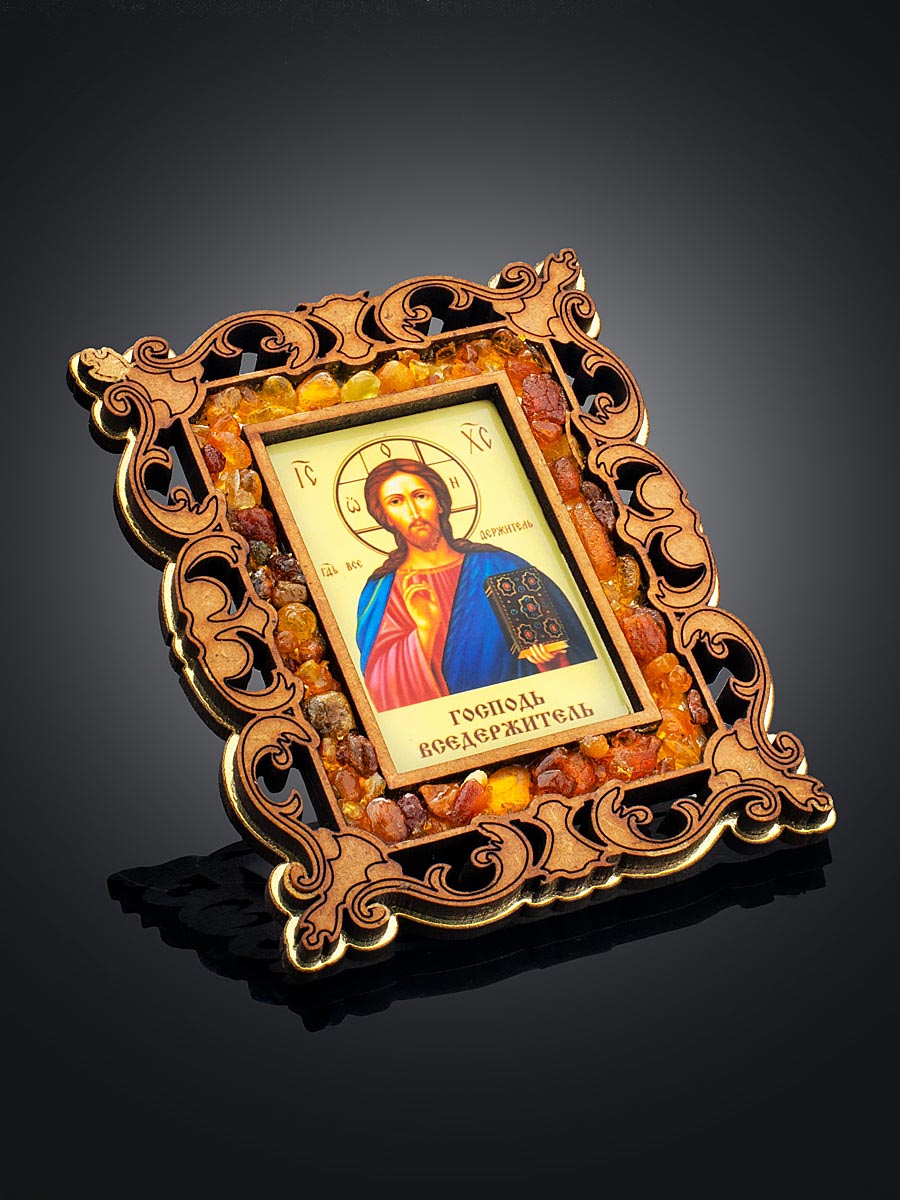 Иконка в резной деревянной оправе с магнитом, украшенная янтарём «Господь Вседержитель»