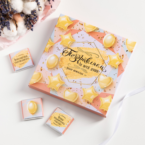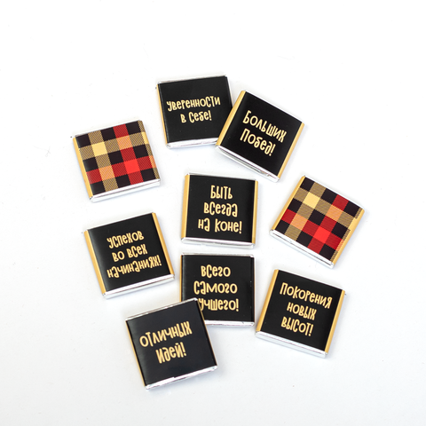 Каждая шоколадка упакована в индивидуальную этикетку с пожеланием.
