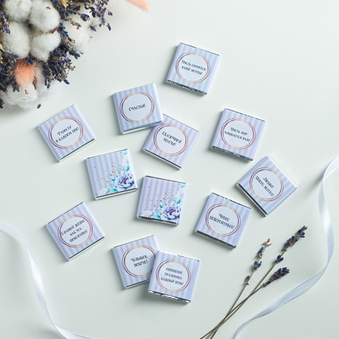 Каждая шоколадка упакована в индивидуальную этикетку с пожеланием.