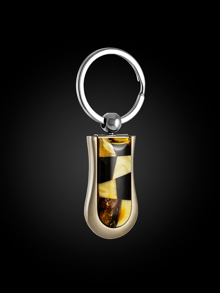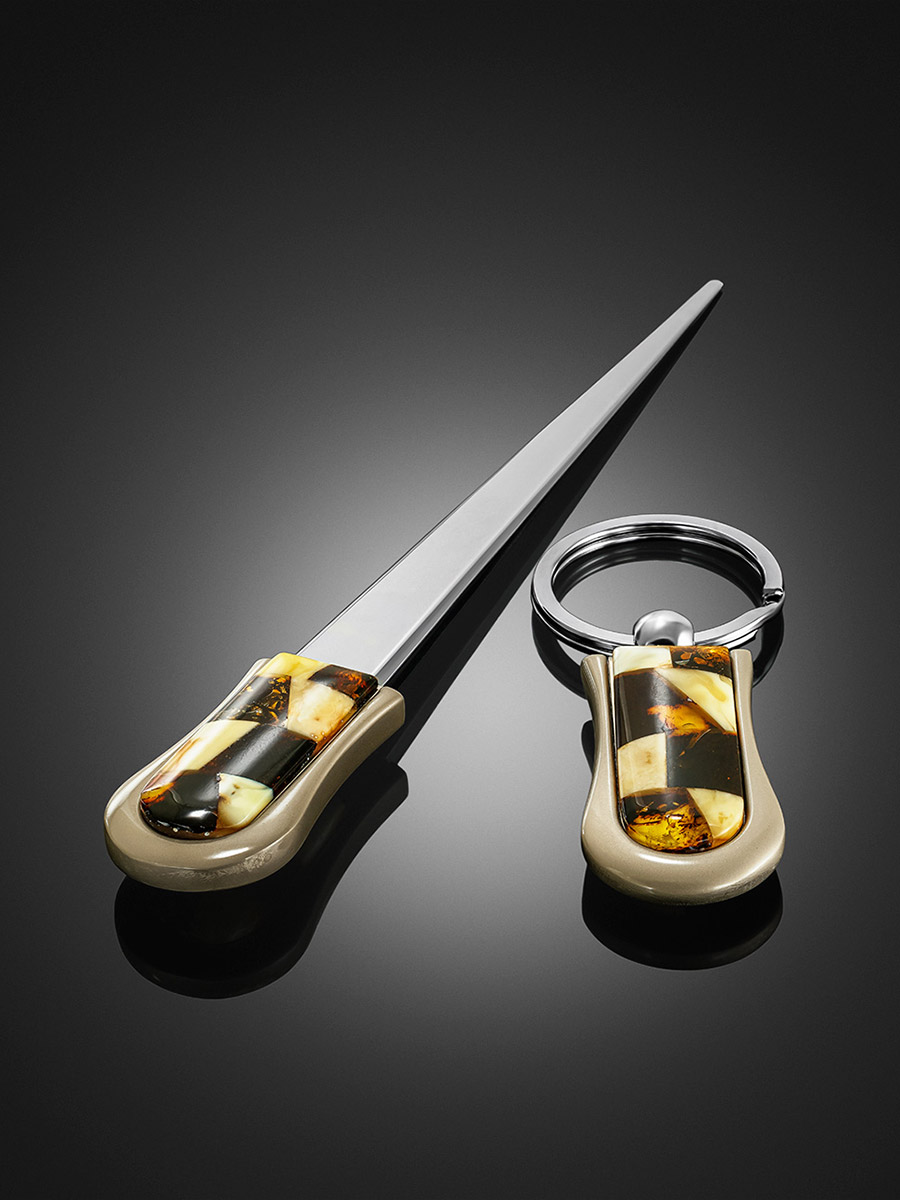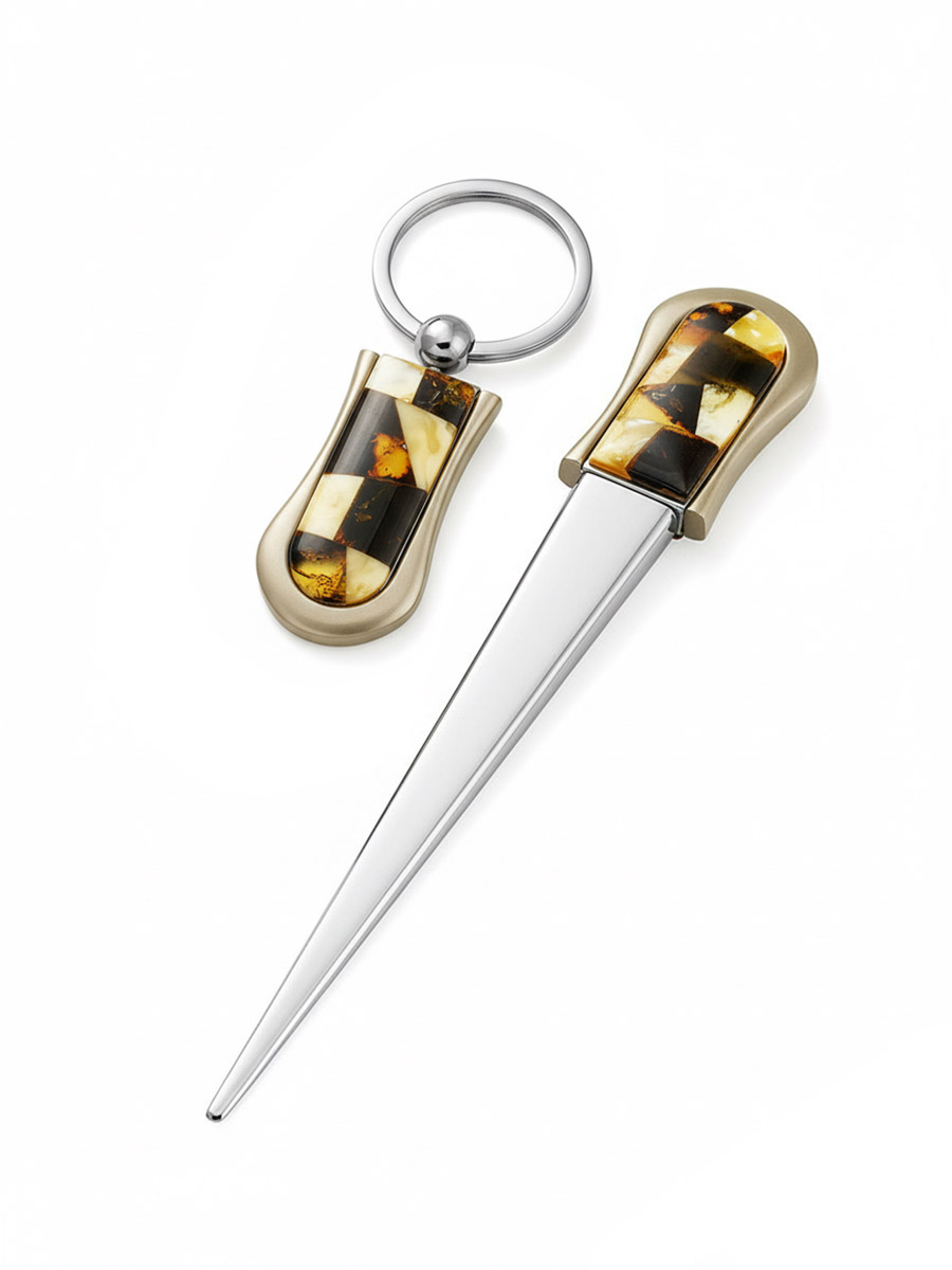Комплект из канцелярского ножа и брелока, украшенных янтарной мозаикой