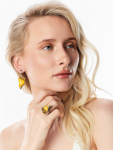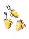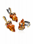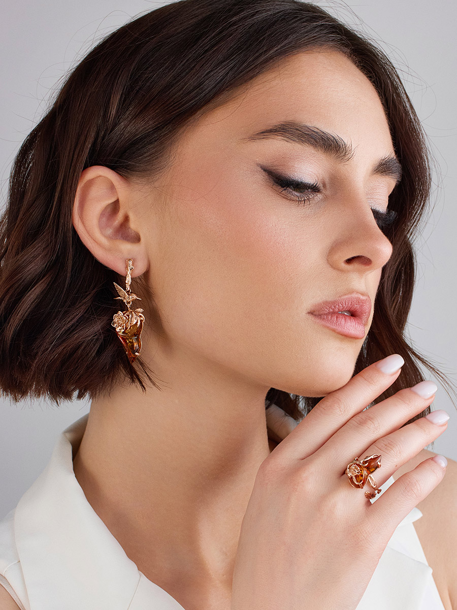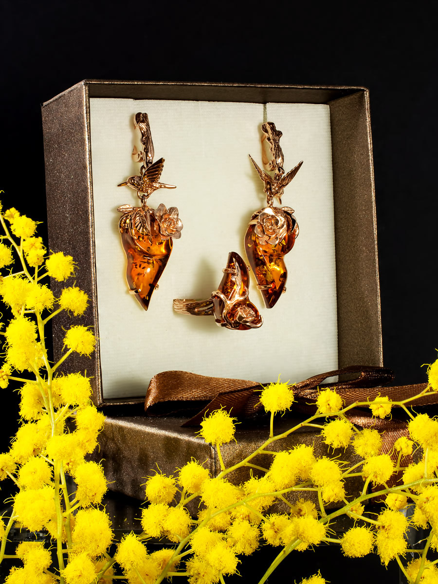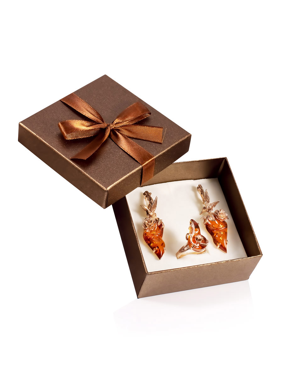 Комплект изысканных позолоченных украшений с коньячным янтарём «Колибри» в подарочной коробке