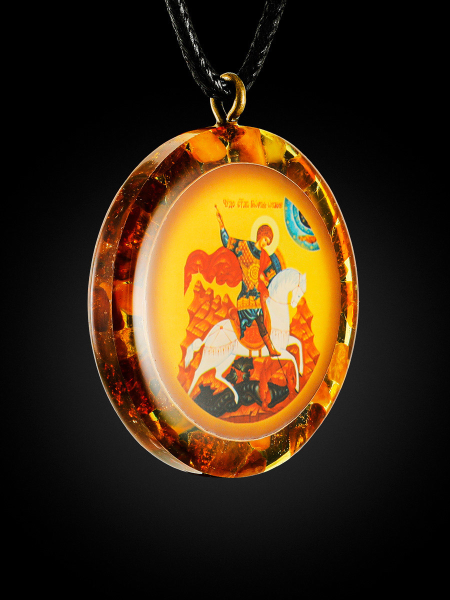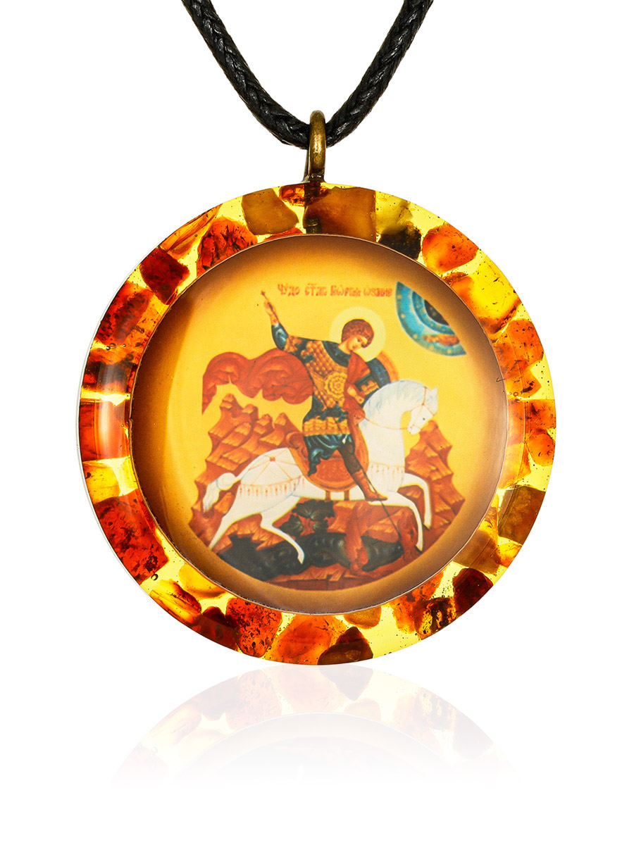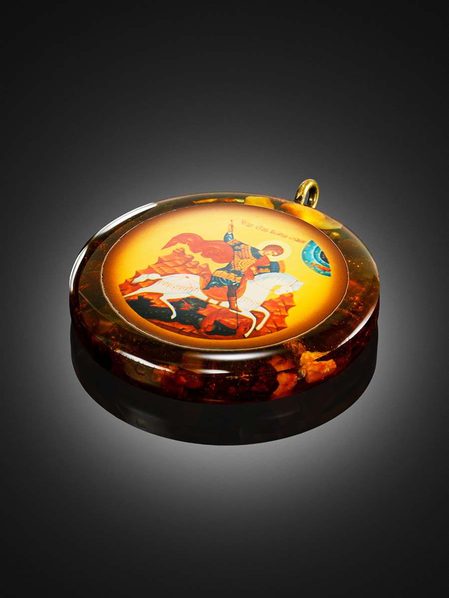 Круглая подвеска-иконка «Георгий Победоносец» в янтарной оправе