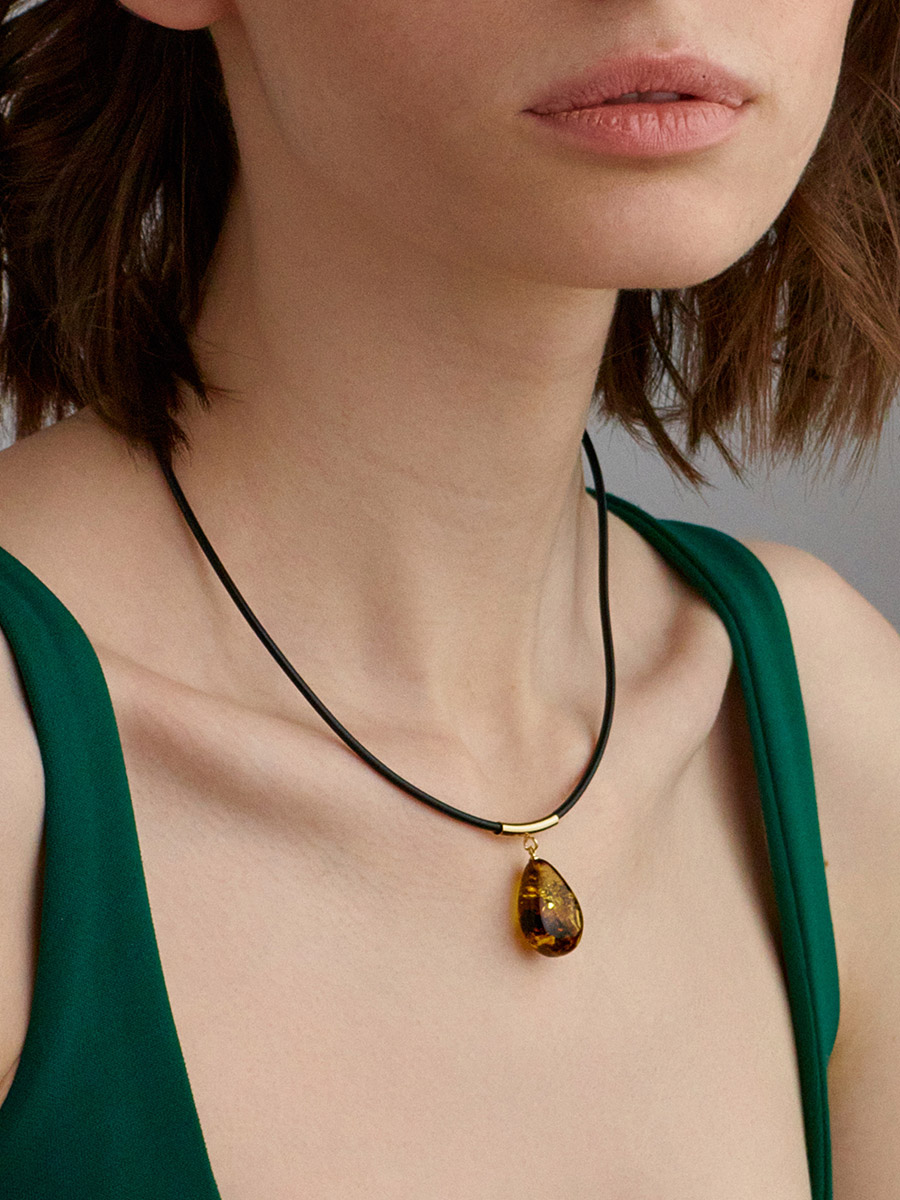 Маленькая аккуратная янтарная капелька необычного зеленоватого оттенка с яркими искрами закреплена на каучуковом шнурке при помощи необычного крепления-трубочки. Оригинальный и необычный дизайн украшения понравится всем любительницам эффектных деталей в образе. Наиболее удачно это колье будет смотреться на открытой шее. _x000D_