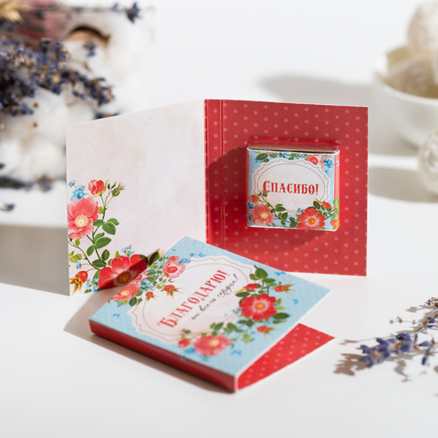 Внутри открытки - 1 шоколадка (вес 5 г., размер: 31 х 31 мм.)