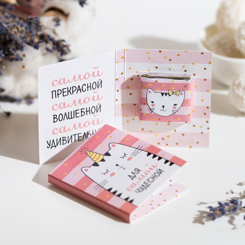 Внутри открытки - 1 шоколадка (вес 5 г., размер: 31 х 31 мм.)