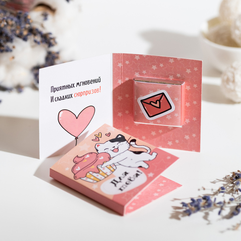 Внутри открытки - 1 шоколадка (вес 5 г., размер: 31 х 31 мм.)