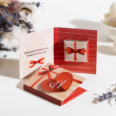 Внутри открытки - 1 шоколадка (вес 5 г., размер: 31 х 31 мм.)