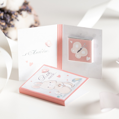 Внутри открытки - 1 шоколадка (вес 5 г., размер: 31 х 31 мм.)