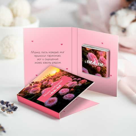 Внутри открытки - 1 шоколадка (вес 5 г., размер: 31 х 31 мм.)