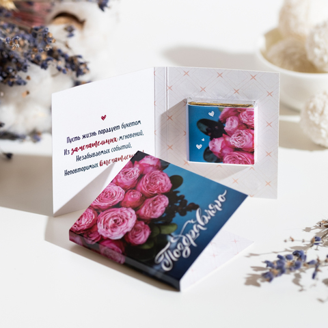 Внутри открытки - 1 шоколадка (вес 5 г., размер: 31 х 31 мм.)