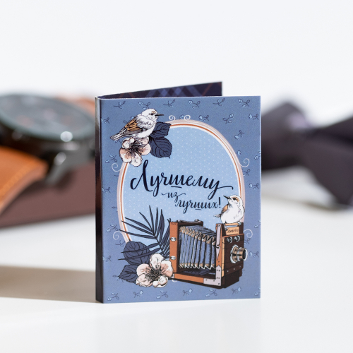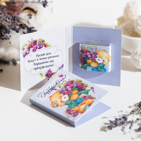 Внутри открытки - 1 шоколадка (вес 5 г., размер: 31 х 31 мм.)