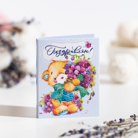 Мини-открытка "Поздравляю (мишка с букетом)"