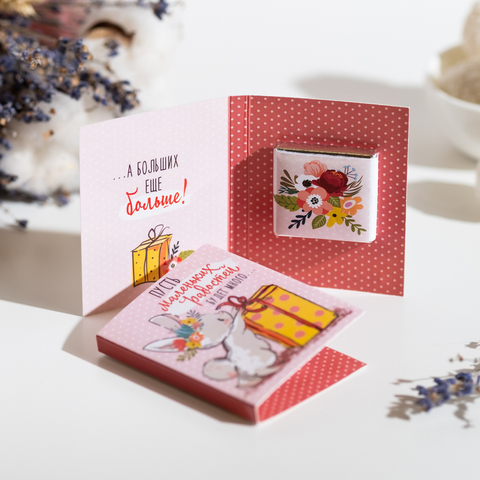 Внутри открытки - 1 шоколадка (вес 5 г., размер: 31 х 31 мм.)