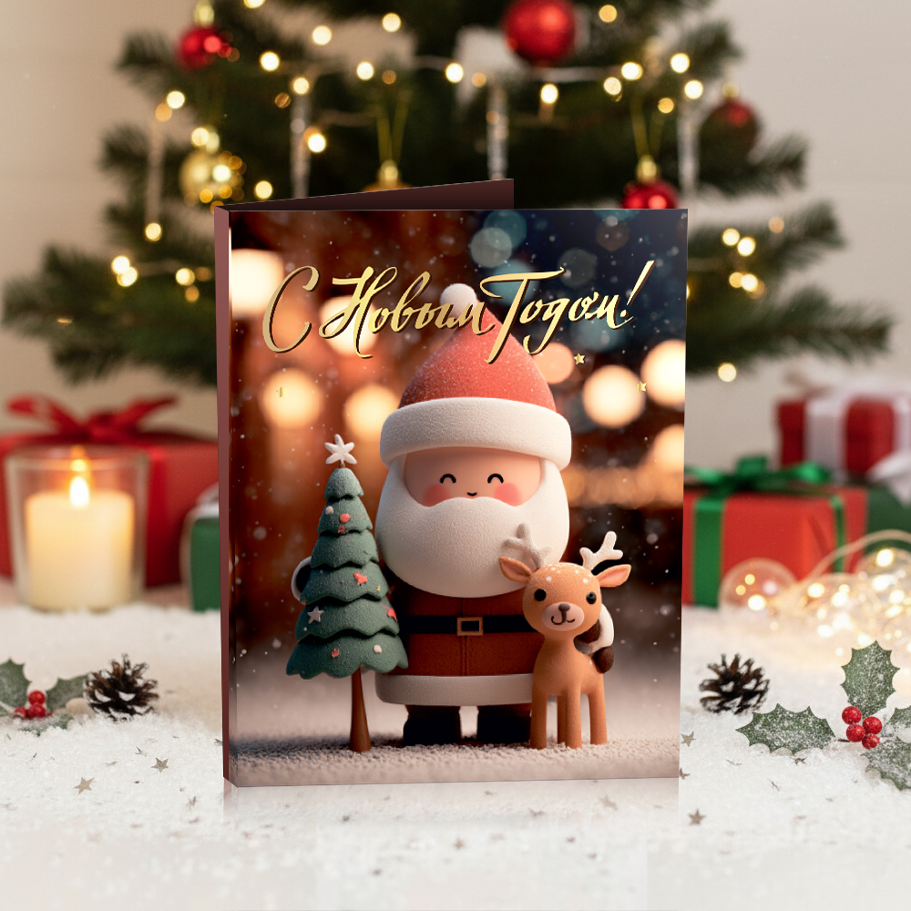 Мини-открытка "С Новым годом (дед Мороз с оленем)"