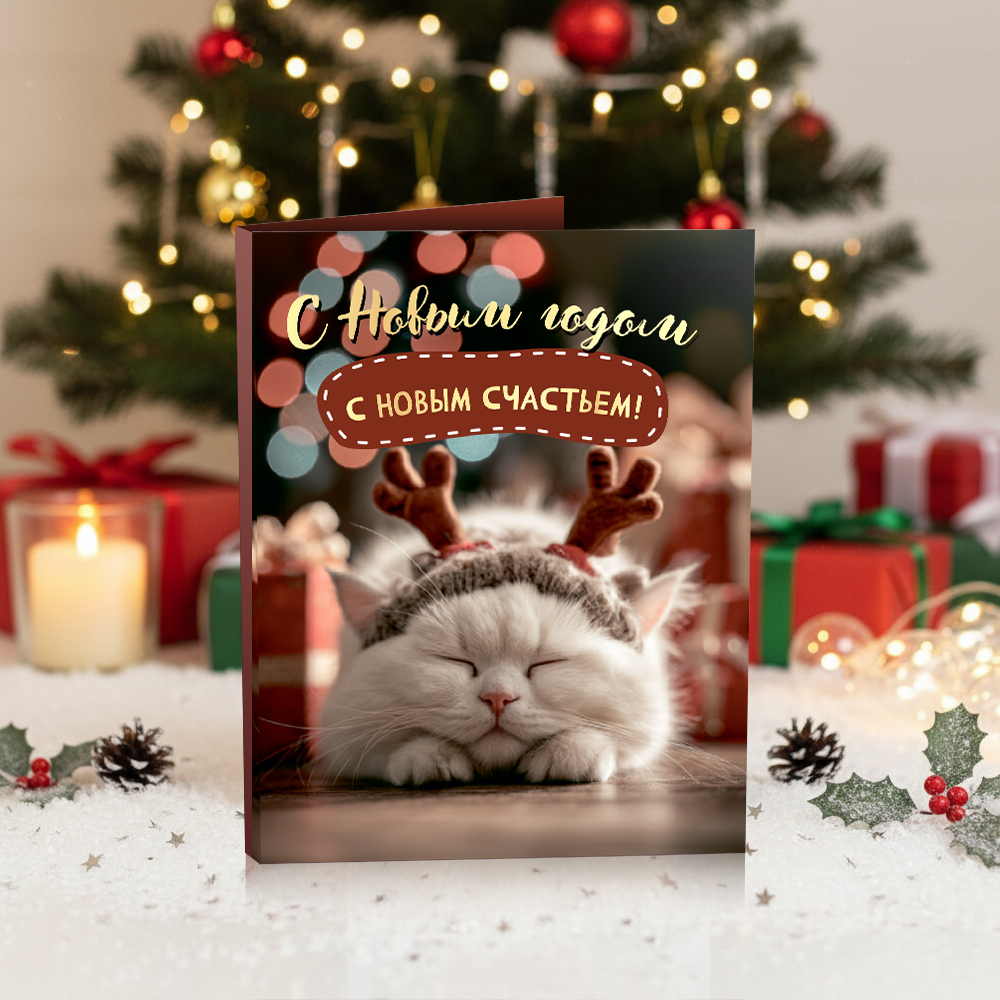 Мини-открытка "С Новым годом, с новым счастьем (белая кошечка)"