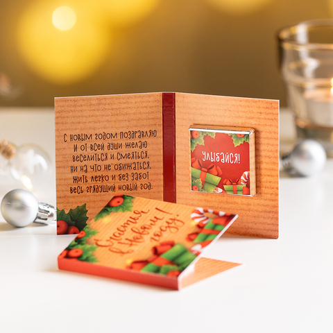 Внутри открытки - 1 шоколадка (вес 5 г., размер: 31 х 31 мм.)