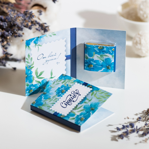 Внутри открытки - 1 шоколадка (вес 5 г., размер: 31 х 31 мм.)