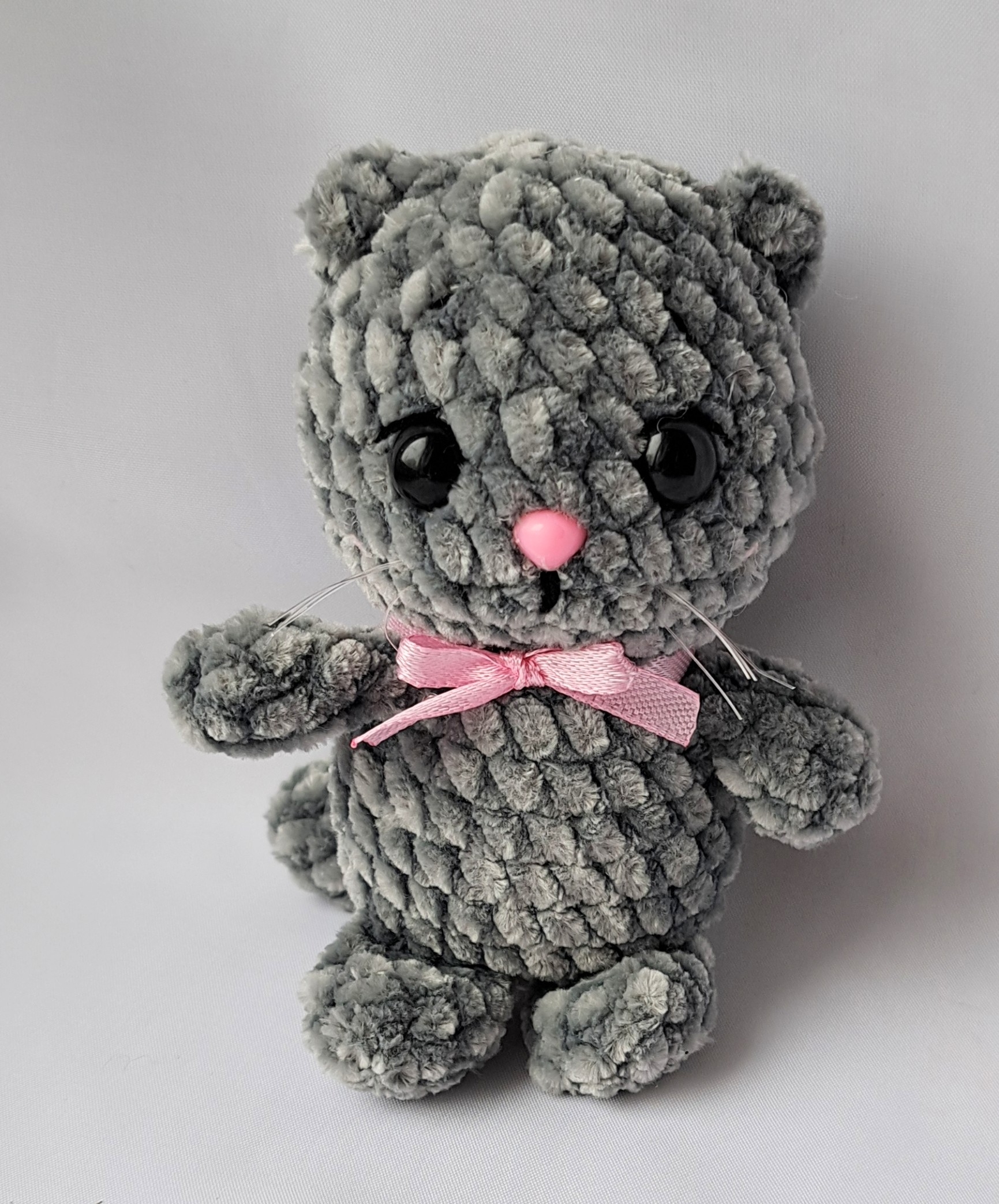 Котёнок связан из плюшевой гипоаллергенной пряжи.