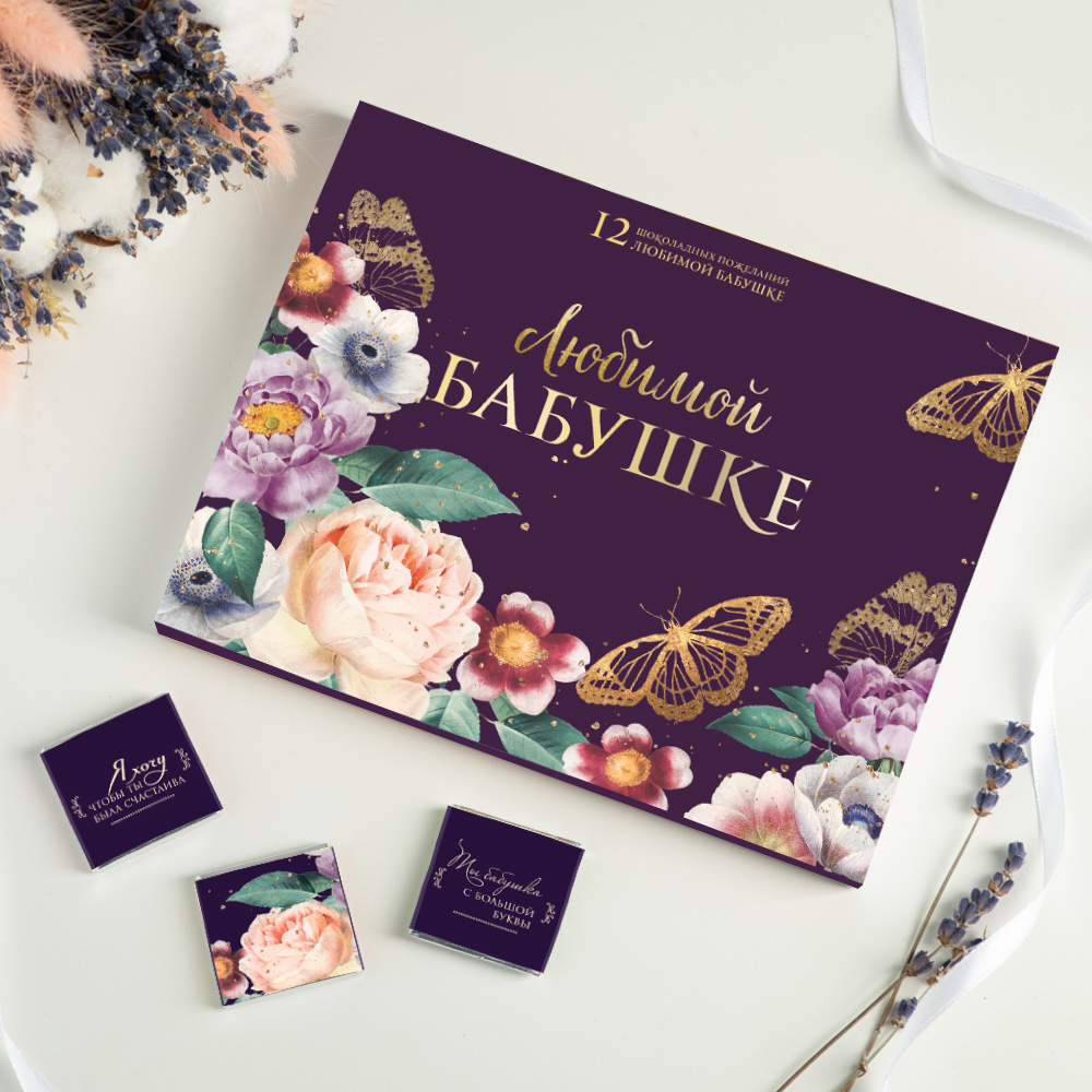 Набор 12 шоколадок "Любимой бабушке" (тёмный фиолетовый с цветами)