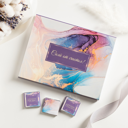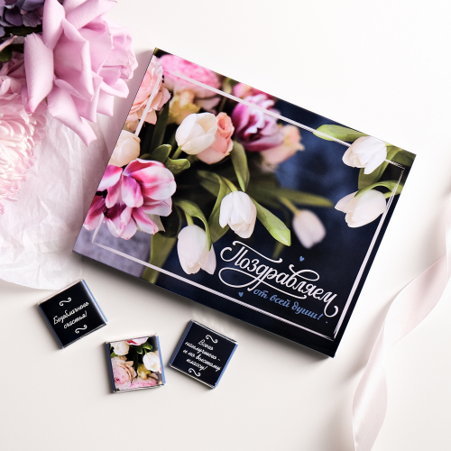 Каждая шоколадка упакована в индивидуальную этикетку с пожеланием.