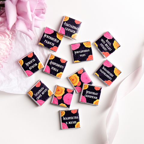 Каждая шоколадка упакована в индивидуальную этикетку с пожеланием.