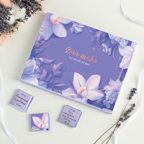 Каждая шоколадка упакована в индивидуальную этикетку с пожеланием.