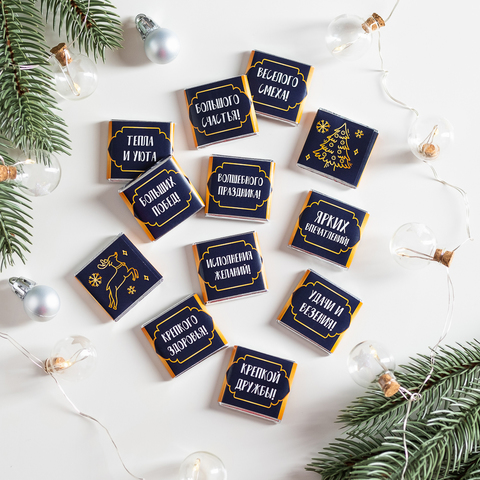 Каждая шоколадка упакована в индивидуальную этикетку с пожеланием.