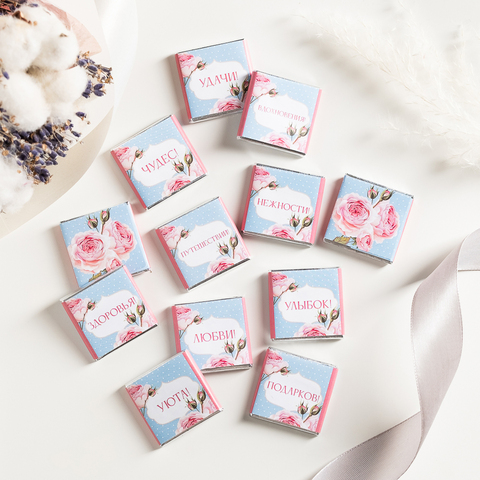 Каждая шоколадка упакована в индивидуальную этикетку с пожеланием.