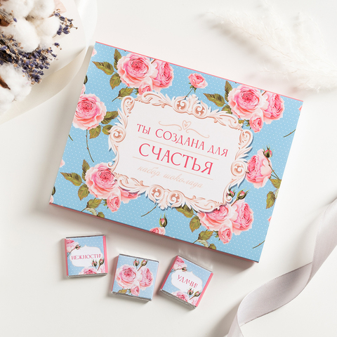 Набор 12 шоколадок "Ты создана для счастья (голубой с розовыми цветами)"